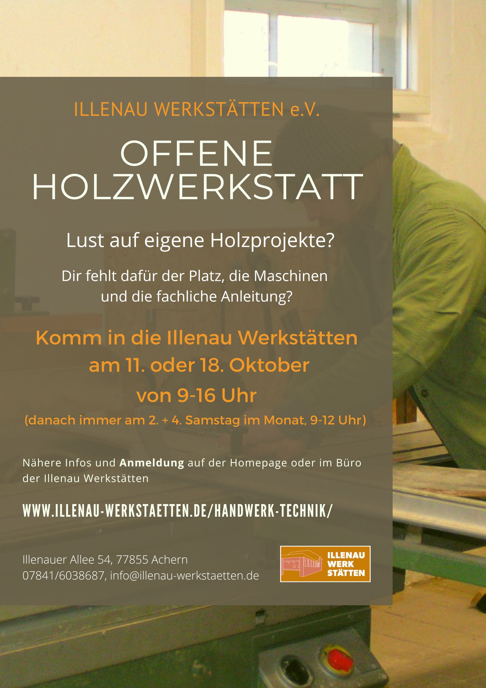Die offene Holzwerkstatt ist am 11. + 18. Oktober von 9-16 Uhr und ab November 2025 und immer am 2. + 4. Samstag im Monat von 9-12 Uhr geöffnet.
